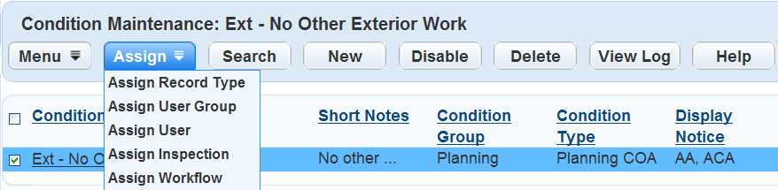 To assign the condition to an Inspection Group or Inspection Type, click Assign and choose Assign Inspection.
