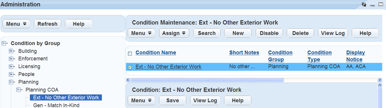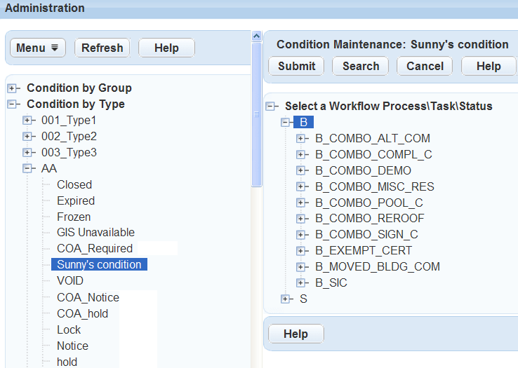 Use the main Administration navigation tree to locate the condition you need. You can locate a condition by Group, Condition Type, Name/Number, Application Type, Inspection, User Group, or User. If you cannot locate the condition name you want to apply, you can search for it. Refer to Assigning Conditions.